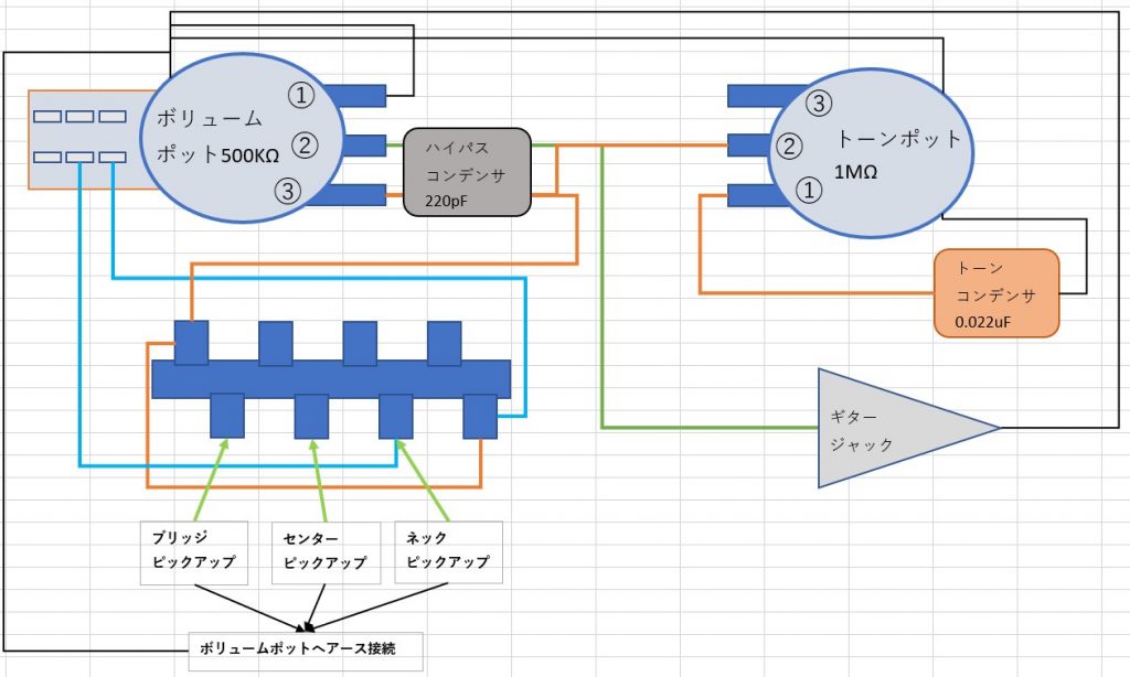 ワントーンにすることで(しない方法もあるようですが)、ブリッジピックアップにもトーンが効いて、音色の幅が広がることを想定しました。