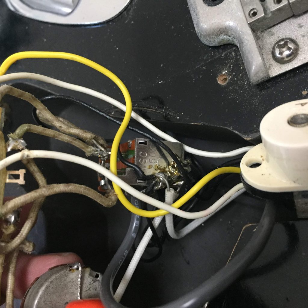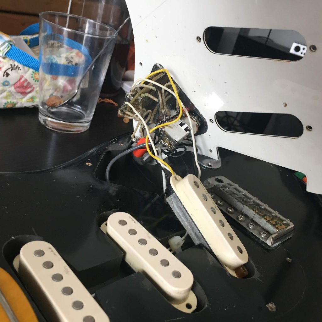 それからシールドのプラグの線や弦アース?用のトレモロスプリングに付ける線など既存の線の長さに余長が少なく、別のハンダをするために引っ張ってハンダ付け(そもそもハンダ付けが甘いが故に)が取れたりと散々。