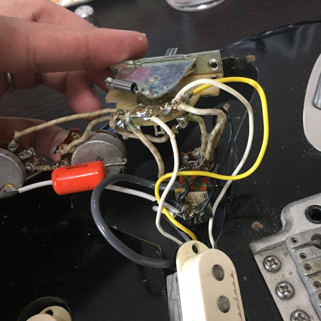 以前はもっと手の込んだ改造がされていたんですけど、最終的にネック、ブリッジピックアップの音が出れば良かったので、ブリッジピックアップ選択時にプル状態の時のみネック、ブリッジピックアップの音が出ます。